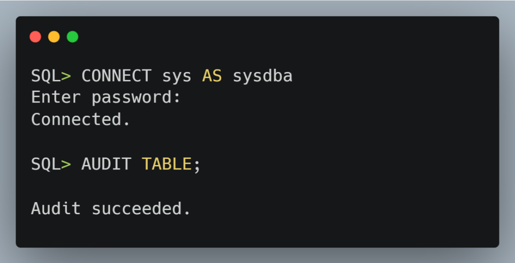 In Oracle, auditing is enabled by the AUDIT keyword and to disabled by the NOAUDIT keyword. After enabling auditing, audit trails are stored either in the database or operating system (we shall use the database). We need to first configure the audt_trail parameter to determine where the trails will be stored. To make this change, we use the ALTER SYSTEM statement in the figure below. Then after, we restart the database to effect the change in the initialization parameter file (this is done by shutting down the database and after we start it up). After this, the database is set to store the audit trails. So, lets dive into this 🎬.